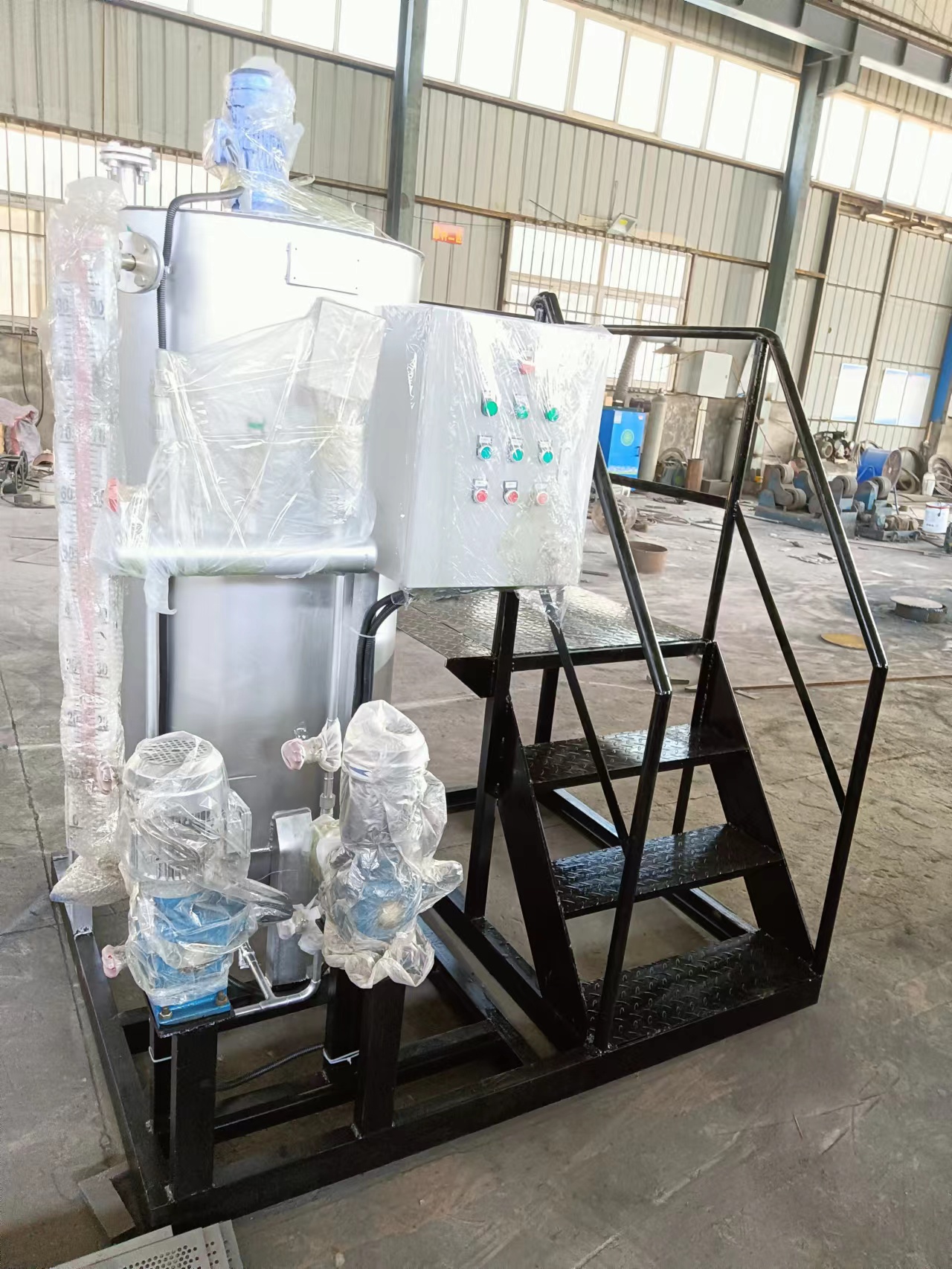 加藥裝置組成結(jié)構(gòu)有:溶液箱、液位計(jì)、計(jì)量箱、攪拌器、加藥計(jì)量泵、安全閥、壓力表、控制柜、閥門以及管路集中布置,各部件的材質(zhì)主要分不銹鋼和碳鋼襯膠。